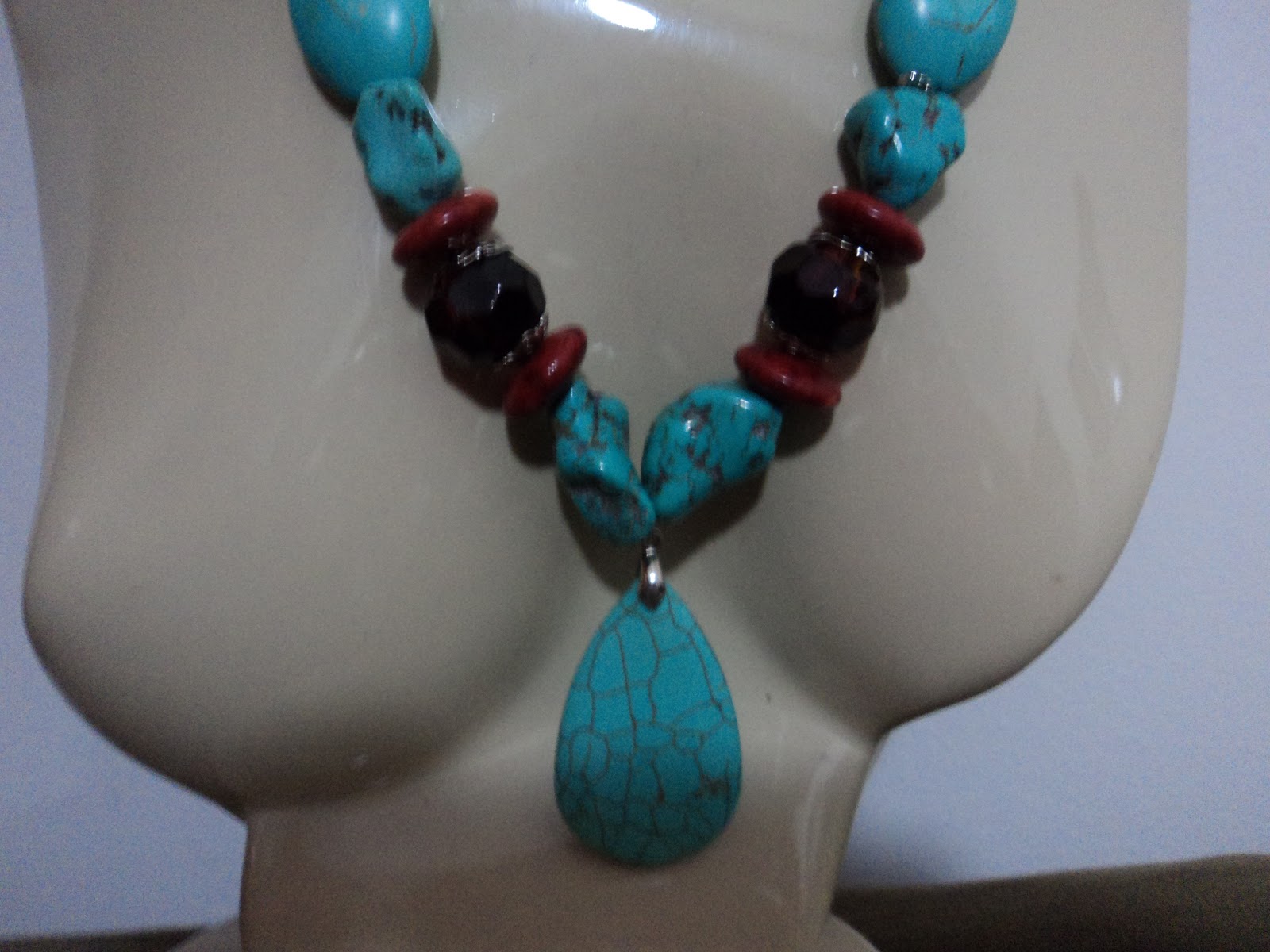 Colar pedras turquesas e vermelhas R$ 28,00